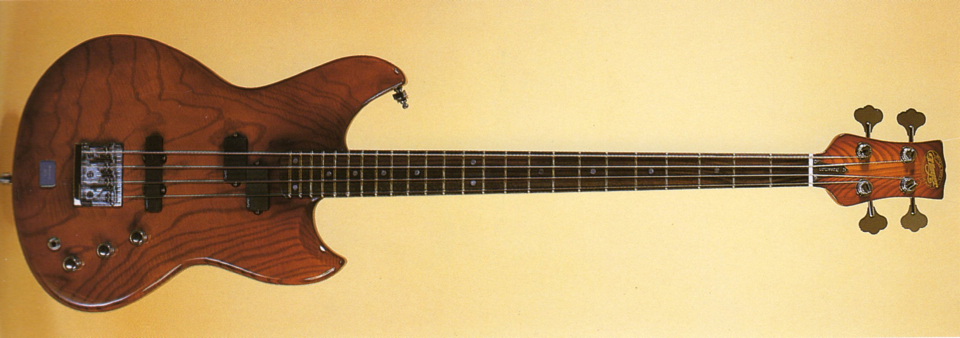 Le modèle Taurus bass Un autre très beau modèle de basse type "Taurus du début des années 80 (1982) avec manche traversant en érable et noyer, touche en wengé, corps en frêne. La forme de la tête avec une tête de taureau incrustée en laiton, est inhabituelle rappelant les Aria asiatiques. Micros DiMarzio, chevalet en laiton massif (admirez !) avec pontets individuels, fixation des cordes à travers le corps. Son poids serait assez conséquent avec près de 5 kg selon un ancien propriétaire ! Comme d'autres modèles cette taurus aurait été fabriquée à quelques centaines d'exemplaires seulement (entre 200 et 300). Elle existait également en version freetless ainsi qu'avec le corps arrondi normalement dans le bas sans la petite pointe... ! |