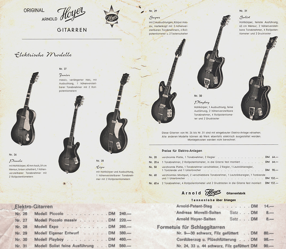 Voici un très rare catalogue de 1961 qui montre les deux premiers modèles solid-body d'Hoyer. Un modèle "27 Junior" avec un seul micro, et un modèle "29 Super" avec deux micros. Je n'ai trouvé aucune photo pour illustrer les modèles de ce catalogue. Si vous en avez une, je suis preneur ! |