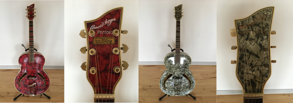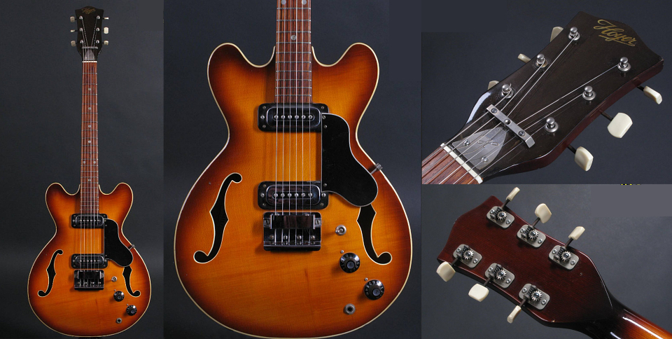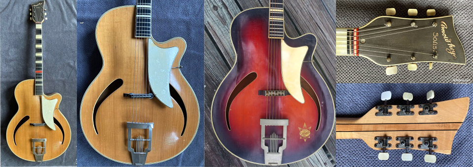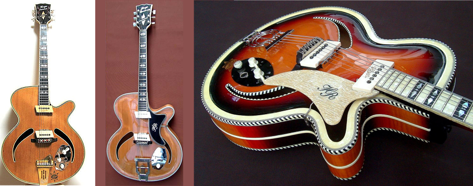Les premiers modèles purement acoustiques arch-top "Her im Frack" et "Solist" (ci-contre) ont été fabriqués tout au long des années 50, et sont des instruments très populaires très recherchés des collectionneurs. De nombreuses variantes ont été produites : - le modèle "Solist" a été l'un des premiers grands classiques de la marque : un pan coupé, forme des ouies caractéristiques de la marque, pas de trussrod, mécaniques assez rustiques, pas d'oeuillets (bushings) autour de l'axe desdites mécaniques. En revanche un cordier assez esthétique, chevalet bois réglable en hauteur. - le modèle "Her im Frack" pas de pan coupé, et par contre, il comporte non seulement une rosace de petite taille située inhabituellement à l'extrémité de la touche, mais encore deux ouies en forme de "f". Comme sur la "Solist", les gros repères de la touche sont rectangulaires. Ci-dessous quelques modèles en finition naturel, cherryburst ou noir. |