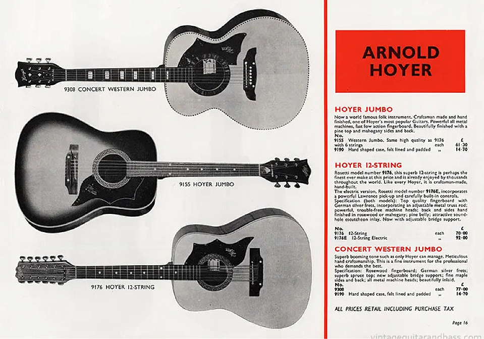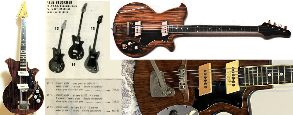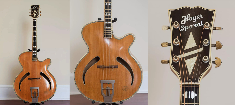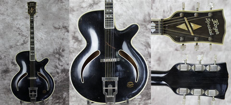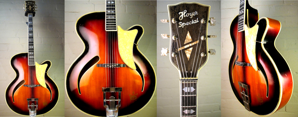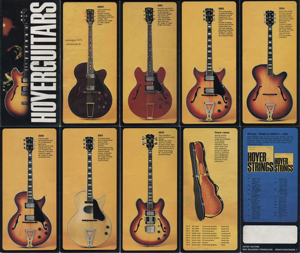 Les guitares HOYER Encore une marque européenne souvent boudée par les "grands livres de la guitare" et ouvrages similaires, et qui n'y figure que très succintement, avec la plupart du temps une seule photo et quelques rares lignes, la part belle étant faite aux productions américaines. Seules exceptions pour les Hofner et Eko qui sont un peu mieux documentées. Moins connue aussi et peut-être, à cause de la taille de l'entreprise qui est longtemps restée artisanale et familiale avec un petit atelier de luthiers qui a fabriqué à la main des instruments d'une qualité souvent remarquable. Mais grace à internet il est désormais possible de mettre des informations à la disposition de tous. Pas facile cependant de faire une chronologie (j'y ai d'ailleurs renoncé) vu l'absence relative de catalogues et du peu de fiabilité des datations annoncées ici ou là. Mais toute incomplète qu'elle soit, j'espère que cette petite contribution sera utile à la connaissance de cette marque. |