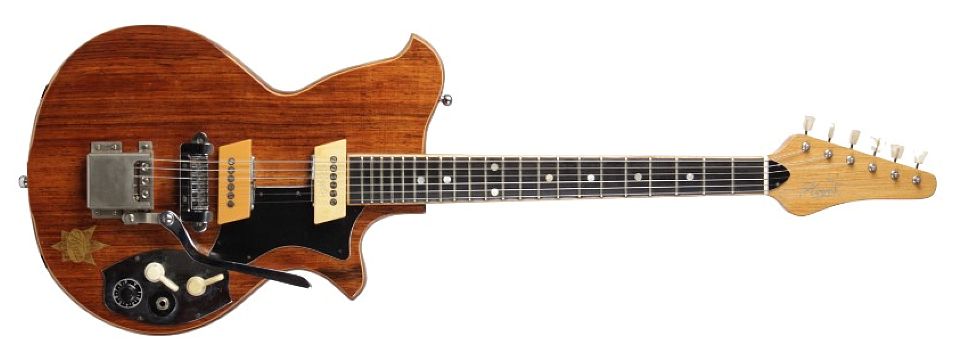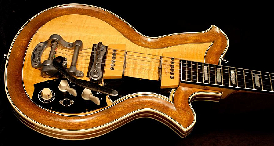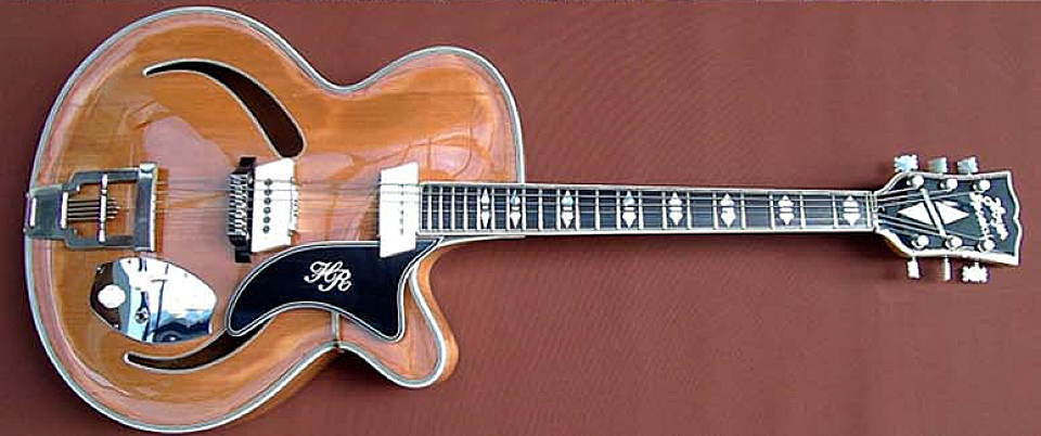 Le modèle 32 Une photo rare de cette extrapolation du modèle "29" avec sa table sculptée, des bindings surabondants, et équipée d'un vibrato Bigsby,avec une prise Din. Probablement produite à très peu d'exemplaires, voire modèle unique (prototype ?) |