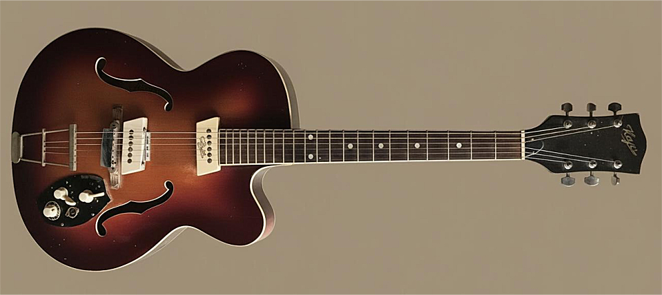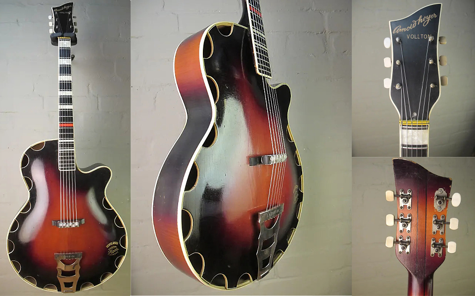 Le modèle Vollton Un modèle rare "Vollton" vers 1958 sans ouies ni rosace, mais avec 15 trous semi-circulaires sur le pourtour de la table d'harmonie ! Vue récemment en vente sur "Réverb" ce modèle exact apparemment très recherché à 2650 €. Vu également un exemplaire en finition noire avec 18 trous au lieu de 15 ! |