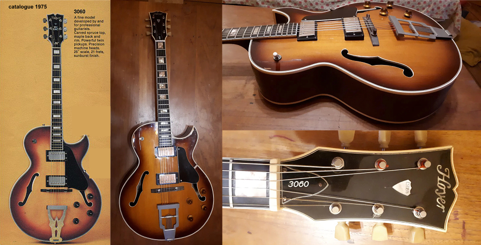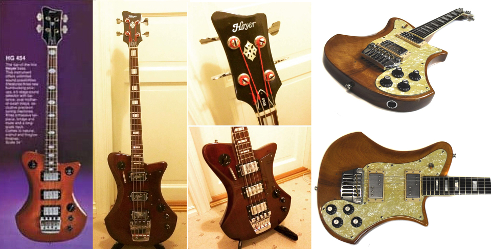 Ici une "HG 454" selon l'extrait d'un catalogue non daté à gauche. Cependant l'exemplaire de basse qui semble lui correspondre (hormis le pickguard, la forme des repères) ci-dessous au milieu est estampillée "5042" ? Enfin à droite une reconstruction de la guitare 6 cordes correspondante. Difficile d'une manière générale de dater ces instruments qui pouvaient varier beaucoup d'une toute petite série à une autre. |