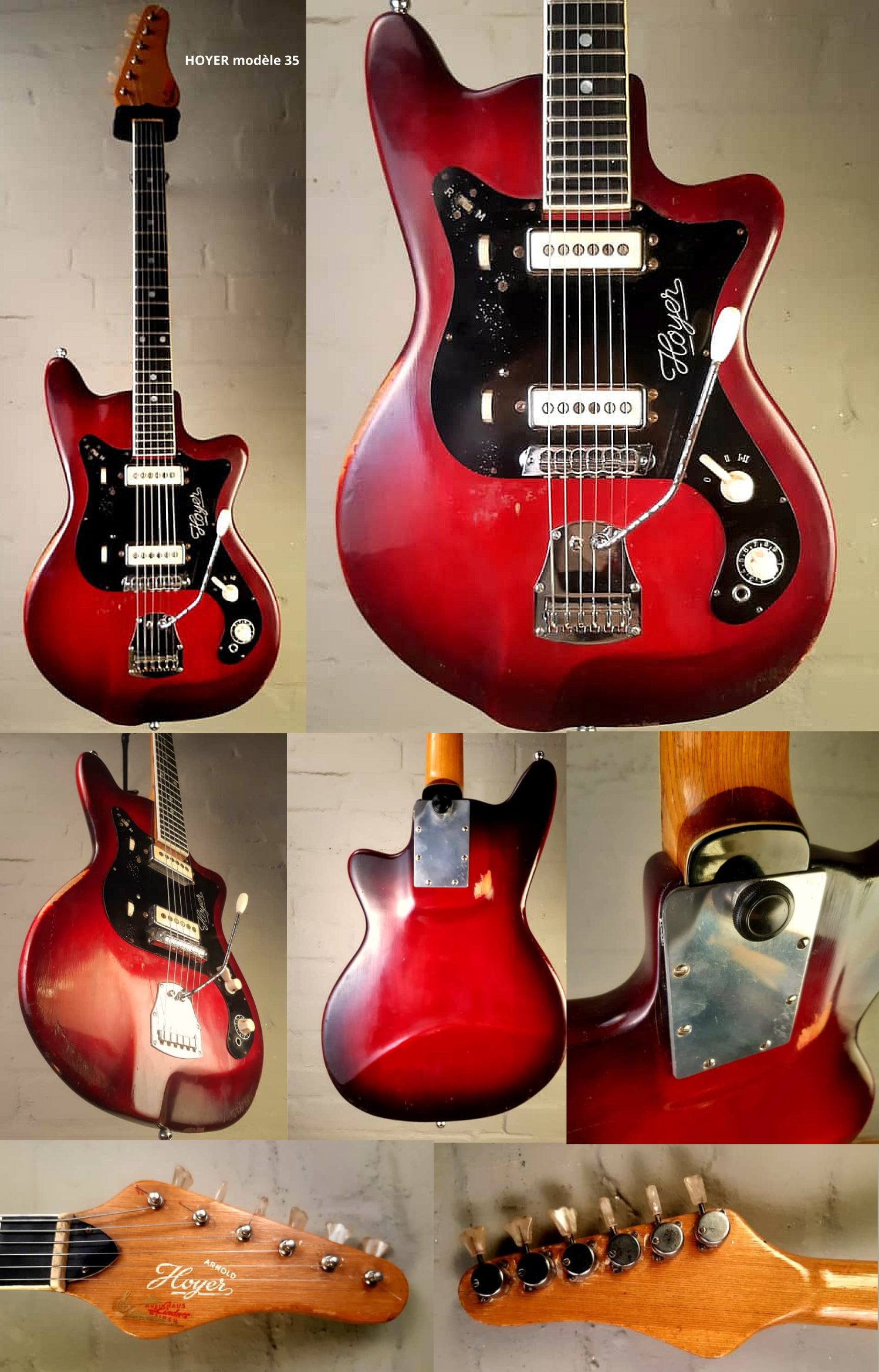Le modèle 35 Voici un modèle qui inaugure la "série 35". Après les n° 27 et n° 34 aux extrémités un peu tourmentées en forme "d'ailes de papillon", Hoyer nous propose une forme de corps plus consensuelle. A noter que les japonais avaient produits, eux aussi, leur série "bizarre" avec les corps surnommés "Tulip. Cette série 35 apparue vraisemblablement vers 1963, possède un corps en acajou, un manche multiplis avec une touche en ébène. Mais cette série 35 arrive avec une particularité très originale pour l'époque sur une solid-body, en ce sens qu'elle possède un corps sculpté avec une diminution de son épaisseur en divers emplacements choisis. Deux suppositions : la première c'est dans le but d'alléger le poids de la guitare car l'acajou n'est pas très léger, ni la touche du manche en ébène ; et la seconde est d'améliorer le confort du musicien à la manière de Fender avec son "confort body", ou de Welson avec une découpe pour le genou droit du musicien qui jouait assis. Si vous avez une réponse documentée, n'hésitez pas à me le faire savoir ! |