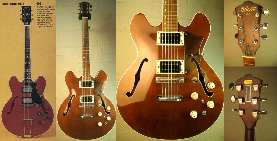 Les 12 cordes Ci-dessous tout d'abord un modèle "727" de 12 cordes électriques au catalogue Hoyer 1966, et ensuite une évolution de la "717" qui devient quelques années plus tard "4061" avec une disposition des micros et potentiomètres totalement différente. Ici en finition tobacco sunburst elle est actuellement sur le site "Réverb" à 5900 € ! |