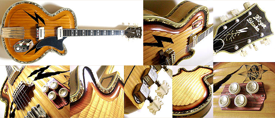 Le modèle Bianka Toujours dans l'exhubérance un modèle atypique et rare que cette "Bianka", avec la caisse de la série "Special", mais ornée et décorée à l'excès avec les ouies en forme d'éclairs ... ! Notez la table et le dos sculptés, la largeur des bindings, etc ... Quelques copies ont été re-fabriquées en 2005. |