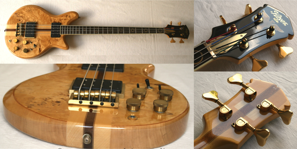 Une autre magnifique basse "HG 452" mais freetless. Joli travail que ce manche traversant en cinq parties, avec les belles mécaniques siglées "Schaller". |