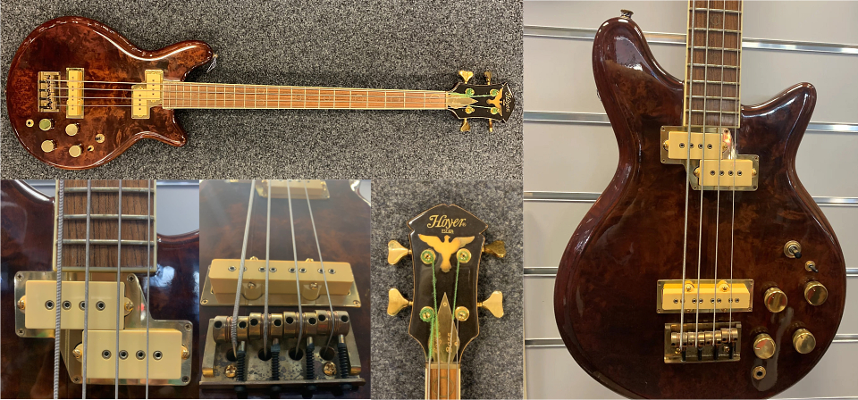 Voici un magnifique exemplaire "Eagle bass" de 1982. Corps en érable et table rapportée en loupe de peuplier, accastillage laiton massif, mécaniques Schaller plaquées or. |