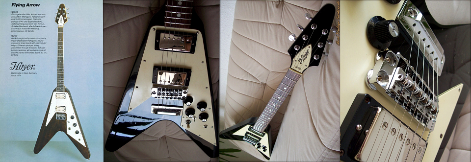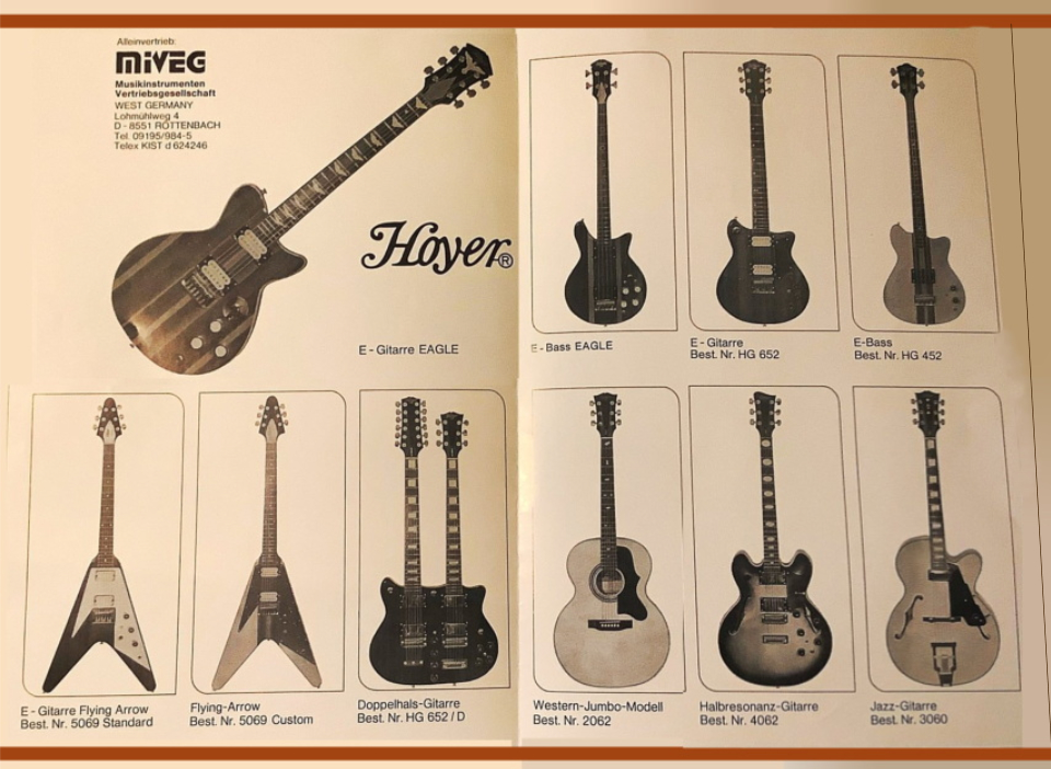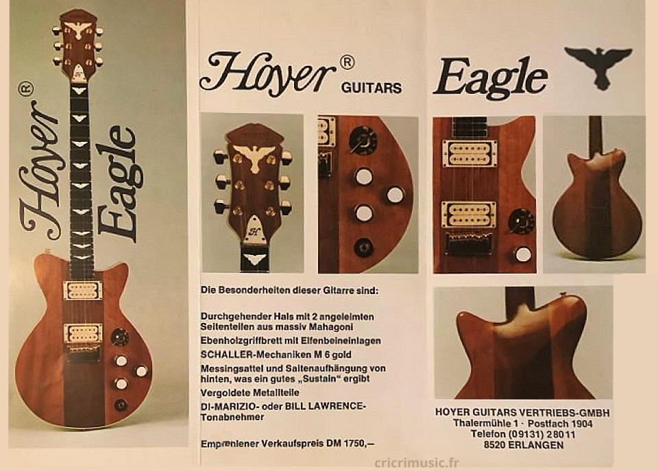 Modèles des années 1980 Dans les années 1980 avec la collaboration du luthier Walter Krahl, les instruments Hoyer n'ont désormais plus rien à envier aux fabrications américaines et atteignent un haut niveau de qualité avec des manches traversants, des micros DiMarzio. Illustration ci-dessous de la série Eagle. |