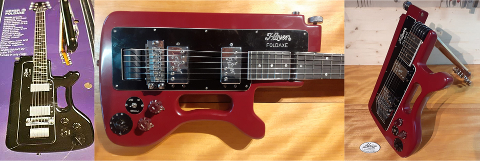 Hoyer "Foldaxe" apparue en 1977. Ce modèle bizare est une guitare de voyage à manche repliable fabriquée à un très petit nombre d'exemplaires. Le site d'un fan qui a entrepris la refabrication d'un modèle d'après un original est consultable sur faceBook : www.facebook.com/profile.php?id=100075993937790 |