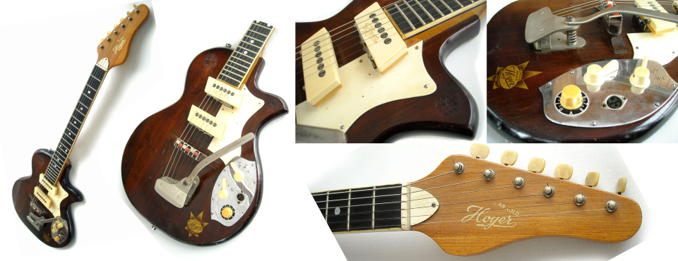 Le modèle "Spécial" a ensuite été décliné en plusieurs versions électriques dont quelques spécimens sont sur-abondamment décorées, les "Spécial HL" et "Spécial SL". Notez la forme en parallèlogramme des micros utilisés par Hoyer. Selon certaines sources ils étaient de fabrication Schaller et seule la forme des capots en plastique était différente. |