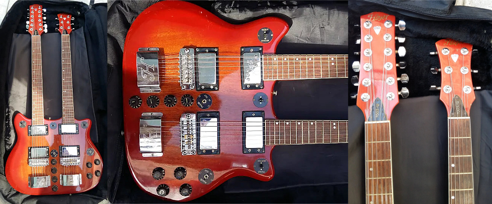 Les modèles double manche "7100" ci-dessous sont d'une part des 6 cordes/bass 4 cordes. Et d'autre part, en dessous sous la référence "7005/12", une version 6 cordes/12 cordes. Les finitions disponibles sont Ivory, Cherry, Walnut. |
