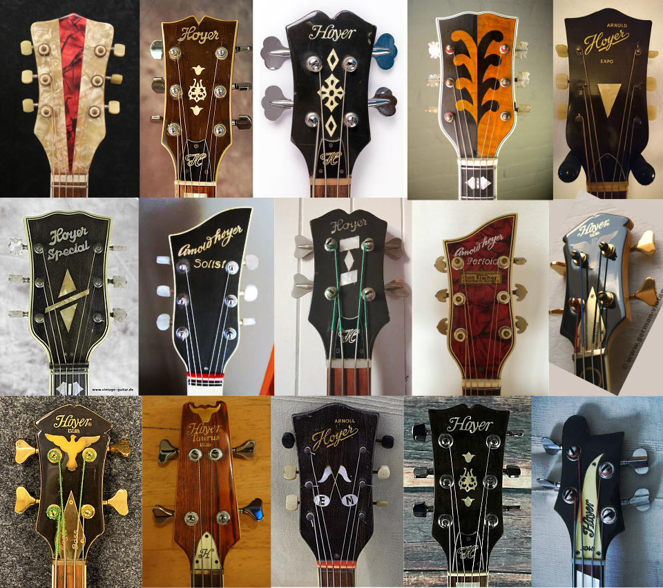 Les différentes têtes Hoyer Ici un petit aperçu des très nombreuses formes et décors des têtes des instruments Hoyer. Souvent on reconnaît une guitare au premier coup d'oeil à la forme de la tête et au logo qui sont sensiblement identiques pour une même marque. Ici ce n'est pas le cas, les formes, couleurs de finition, les logos, les caractères de la marque, tout est différent. |