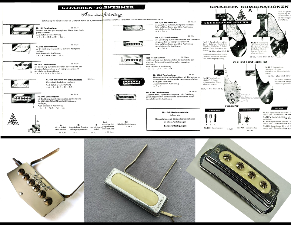 Petit apparté sur les micros "IDEAL" dont est équipé le modèle 27 ci-dessus, l'un des tout premiers solid-body de la marque vers 1961/1962. Les fabricants Allemands qui commencèrent à équiper leurs modèles de micros, firent appel à la firme Berlinoise "FUMA" (Feinmechanik und Massenartikel Reinhold Knispel & Co. G.m.b.H) qui proposait sous la marque IDEAL une gamme complète de micros pour guitares, comme l'illustre la publicité d'époque ci-dessous. |