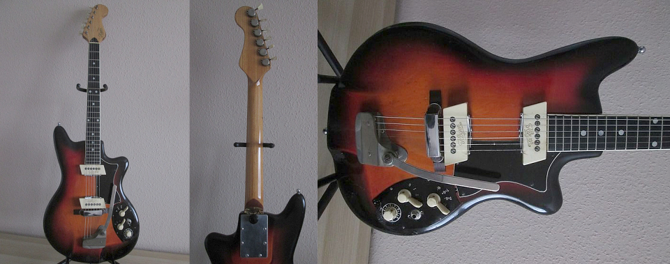 Un très beau "modèle 30" aussi appelé "Playboy" qui pouraît dater de 1963/1964. Il est un peu différent du modèle catalogue 1961 ci-dessus, de par la disparition de la plaque de contrôle rectangulaire, remplacée par les potentiomètres maintenant habituels disposés à travers la table de la guitare, de par un cordier équipé d'un vibrato, de repères de touche en forme de losange, etc ... |