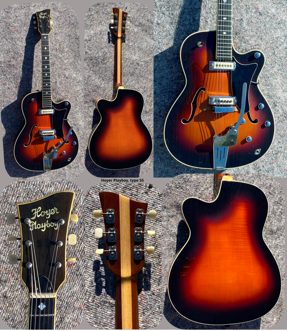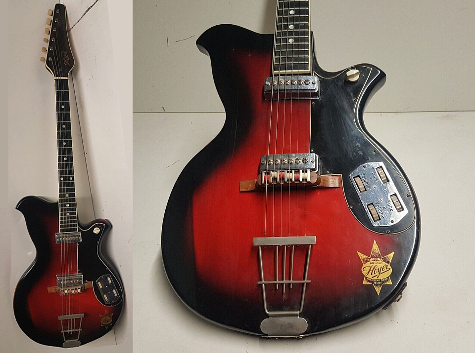Ci-dessous un "modèle 27 " de 1961. Il adopte les micros de forme trapézoïdale (le capôt), un chevalet en métal et une plaque de contrôle de forme ovale certainement de fabrication Schaller. Quelques restrictions toutefois car j'observe que la plaque de contrôle qui recouvre partiellement le logo "Hoyer", inscrit sur le corps, plaide pour une plaque plus grande que celle d'origine, et est munie d'une embase de type jack 6,35 alors qu'à l'époque les embases étaient toutes de type "din". De plus le chevalet métallique (un Schaller) ne me paraît pas d'origine. Il devrait être en, bois. |
