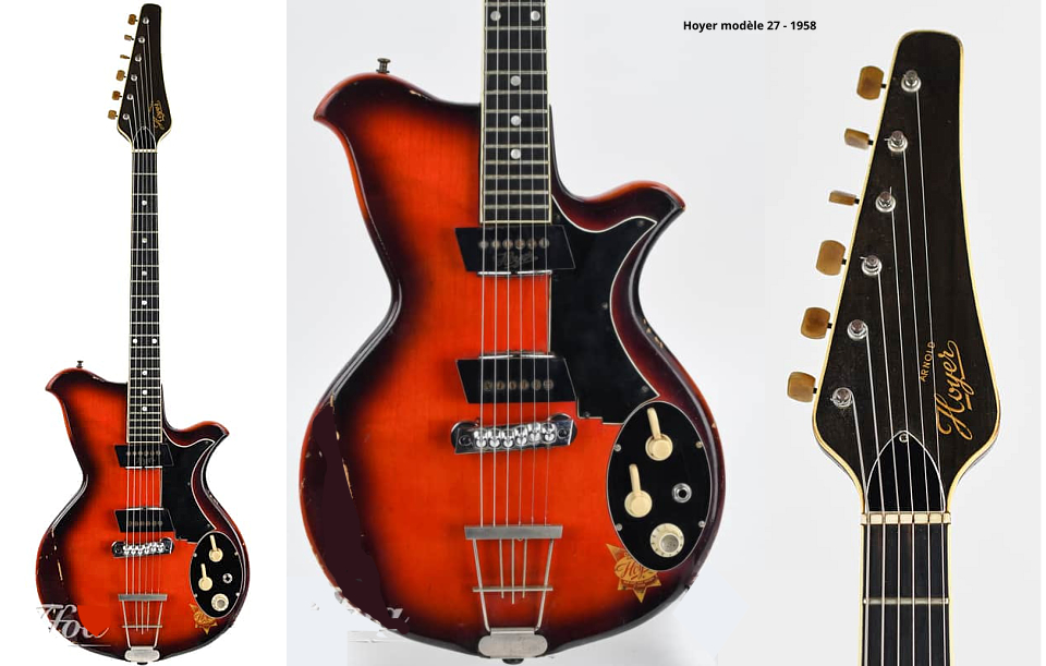 Le modèle 27 Pour ce modèle solid-body de 1962, Hoyer nous interpelle d'emblée de par la forme atypique des extrémités des "cornes", que j'appelle en "aile de papillon", ainsi que par la longueur inhabituelle de la tête que l'on trouve quelquefois sous l'appellation de "tête harpe". La photo ci-dessous est le "modèle 27 I", qui est un modèle rare de solid-body en 1962. Ce modèle s'est vendu récemment 1748 € sur Ebay. Elle est en bois massif et mérite bien l'appellation d'extra-plate puisque le corps ne faisait qu'à peine 3cm d'épaisseur ! Le corps serait en aulne, le manche en érable avec une touche ébène. Elle équipée de micros de la marque "IDEAL" qui étaient parmis les rares disponibles au début des sixties. Remarquons également la plaque de contrôle métallique rectangulaire vissée par dessus le pickguard et qui sera remplacé rapidement par des plaques ovales d'origine Schaller. |