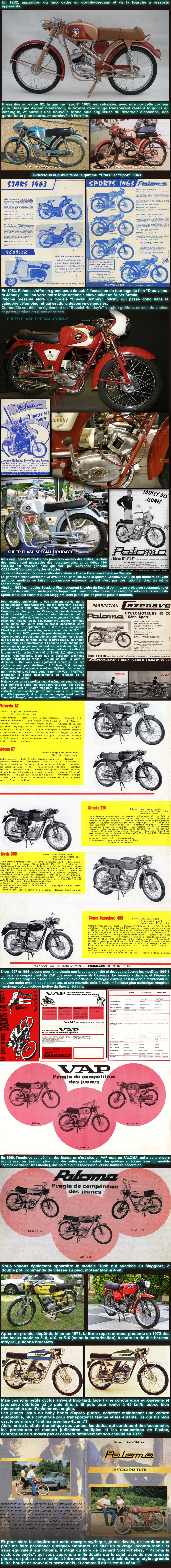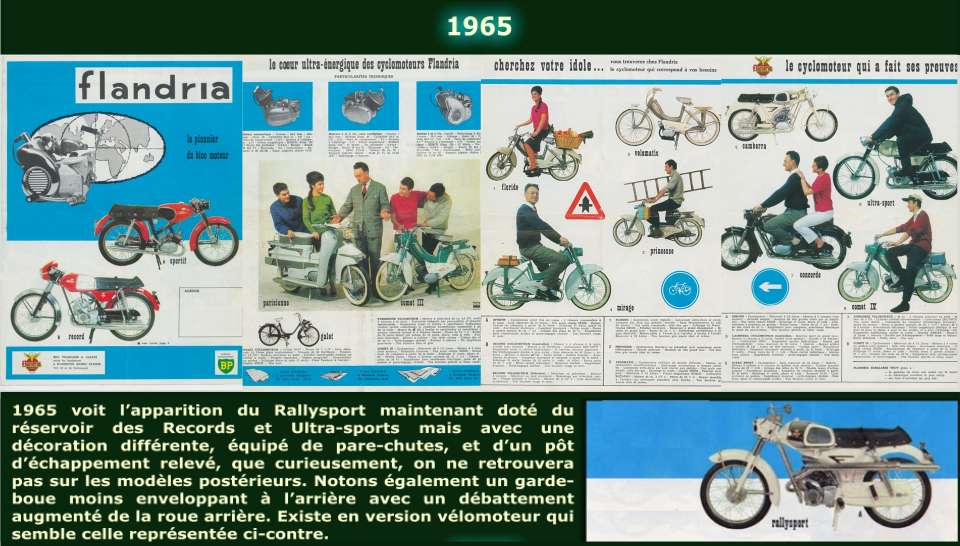 Une petite rétrospective de ce qui nous faisait réver (un truc de plus) et que les plus veinards d'entres-nous ont eu la chance de pouvoir chevaucher. Nous n'avions ni l'âge, ni les moyens financiers de nous offrir une moto et à fortiori une voiture, c'était donc naturellement vers la mobylette que se tournaient nos regards. En effet, la vogue de ces "cyclomoteurs" (cylindrée inférieure à 50 cm3) tient pour partie à ce que l'on pouvait les conduire à partir de 14 ans sans autorisation particulière. La catégorie supérieure "vélomoteurs" (motos légères) nécessitait d'avoir 16 ans et l'obtention d'une "licence" (permis A1) délivrée après un examen théorique. A partir de 1957, ces deux critères qui ont freiné l'accès aux "vélomoteurs", incitèrent les constructeurs à réorienter leurs fabrications vers les cyclos, entrainant le déclin puis la disparition de la moto française. Si vous êtes intéressé par le sujet, je vous conseille d'aller visiter le site Zundapp qui traite des différents réglements concernant les BMA, cyclomoteurs, vélomoteurs, et de leur impact sur la production industrielle française. Un travail remarquable et édifiant à consulter ici : http://www.zseft-zundapp.com/archives/2011/01/16/33074635.html Bref au début des sixties tous les jeunes qui le peuvent roulent en "mob" et de préférence en version "sport". C'est également le moyen de transport le plus économique pour les travailleurs en province, et j'ai le souvenir de ces cohortes pétaradantes de deux roues qui nous réveillaient à six heures du matin pour amener les ouvriers à leurs usines. Heureuse époque où il y avait encore de nombreuses usines et pas mal d'emplois dans ce petit bassin industriel de l'Aveyron où je passais mes vacances ... Les parkings des entreprises étaient pleins de cyclos ! Cinquante ans après si vous avez le bonheur d'y trouver une usine en activité, son parking est rempli de voitures ... comme quoi les ouvriers sont maintenant plus riches, mais c'est fini, il n'y a plus de boulot ! Revenons à nos moutons ... C'est à partir du milieu des années cinquante que les constructeurs Italiens commencent à proposer des cyclos "sports" avec réservoir horizontal, selle biplace, 2 ou 3 vitesses, bien plus séduisant que nos mobs utilitaires. Le top c'était d'avoir des petits guidons "bracelets", la selle biplace façon "panthère", les gaines de cables multicolores, et le couronnement c'était l'antenne avec la queue de tigre .... d'un parfait mauvais goût je vous l'accorde, mais bon c'était la mode. Mais nos fabricants français vont réagir et proposer également des modèles plus modernes pour résister, pour un temps du moins, à cette concurrence et séduire une clientèle plus jeune.  |