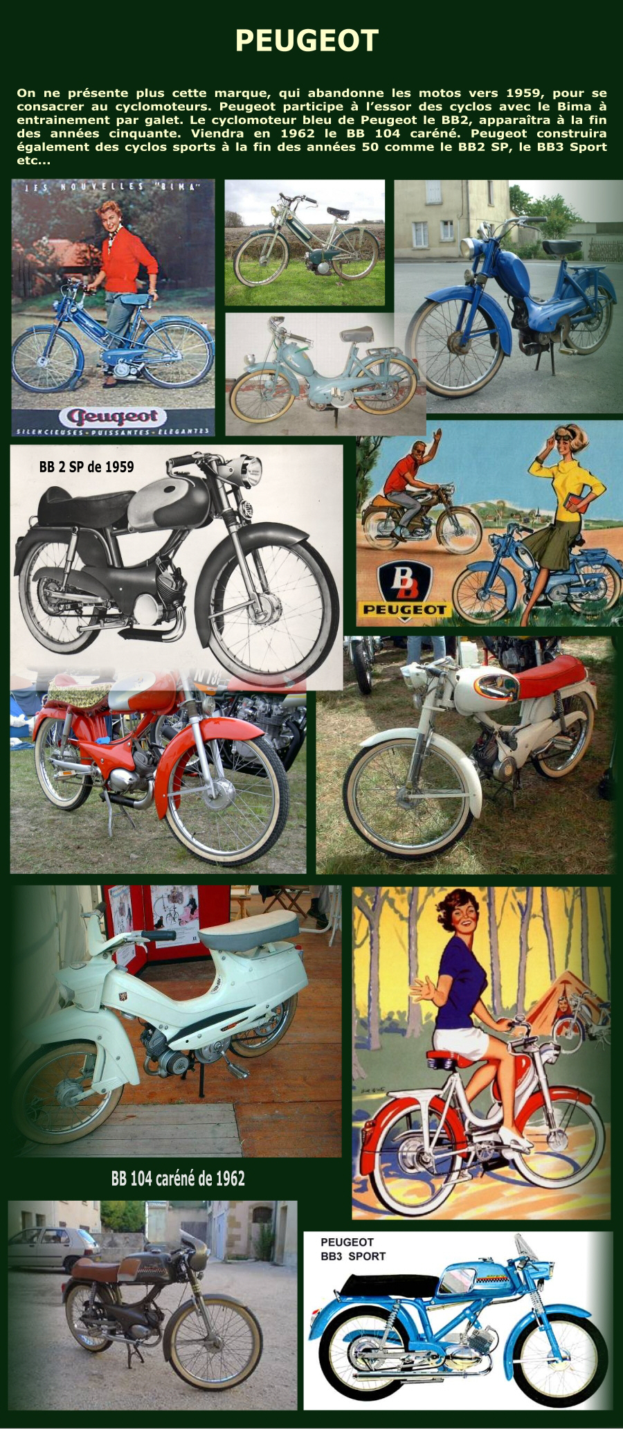 Comme beaucoup de fabriquants des années 40, Peugeot ne produisant pas de moteurs pour les bicyclettes, et fait appel à VAP qui fabriquait des moteurs adaptables sur n'importe quelle bicyclette pour en équiper quelques spécimens. Dès 1950 Peugeot présente son premier modèle à galets le BMA 25 (Bicyclette à Moteur Auxilliaire) qui va devenir l'un des plus vendu à travers ses multiples déclinaisons. Du modèle simple à cadre de bicyclette, au modèle avec fourche téléscopique, jusqu'au modèle grand luxe et qui préfigure le modèle BB.  |